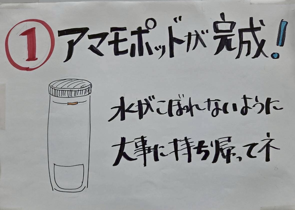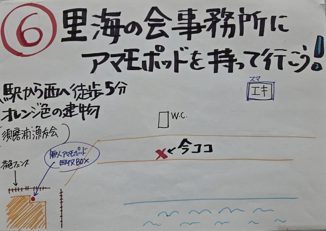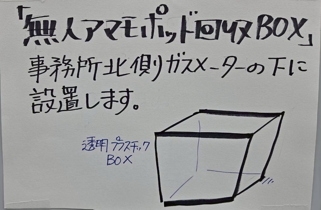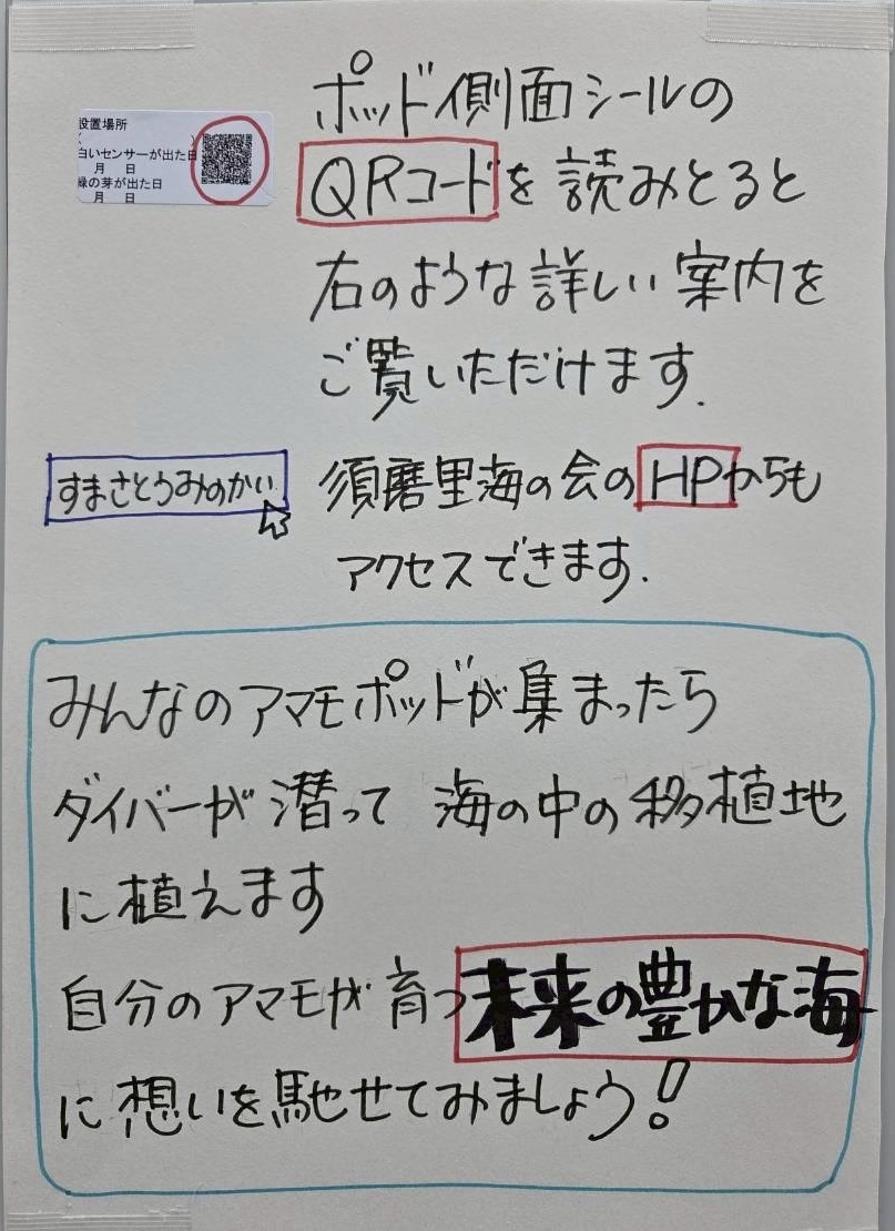 6. 葉が出たポッドを回収期間中に里海の会事務所までお持ちください。「無人アマモポッド回収BOX」を事務所北側ガスメーター下付近に設置します。ポッド側面シールに、設置場所・日付の記入があるのを確認して入れてください。