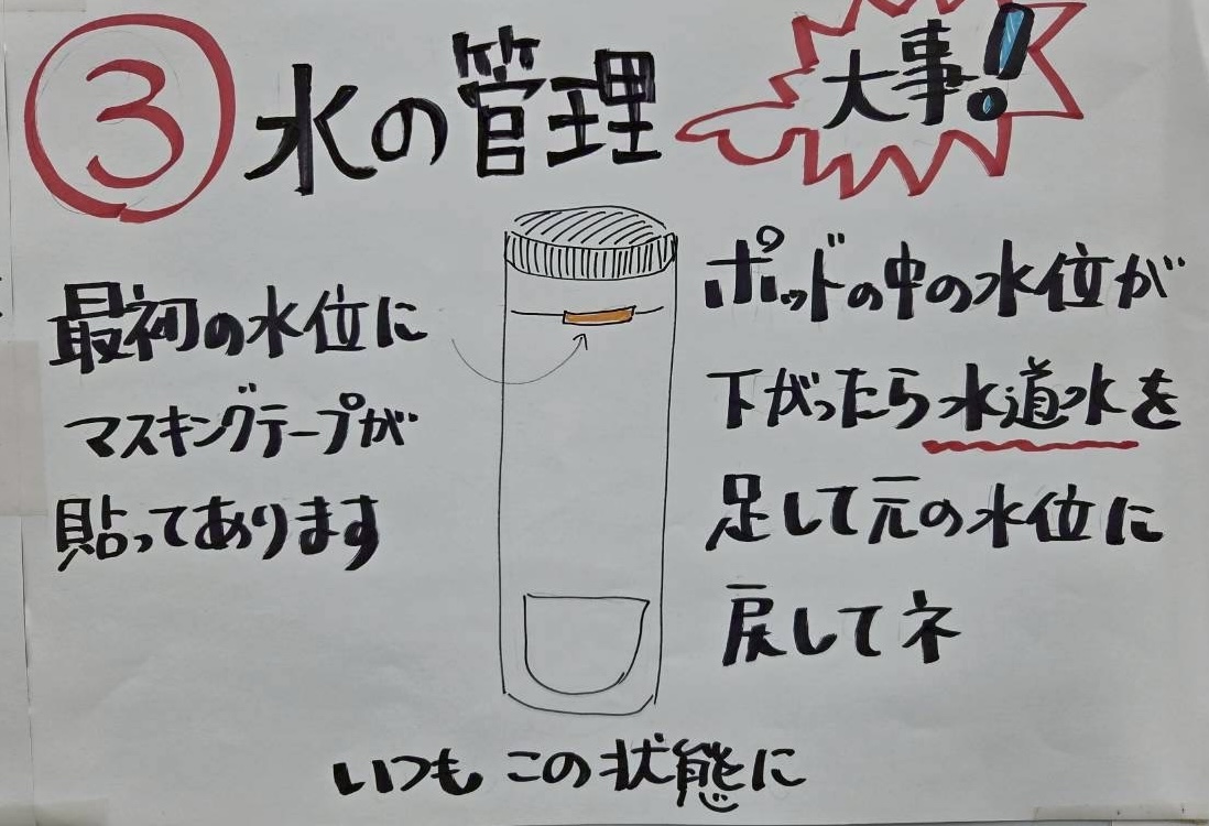 ポットの中の水は海水を真水で薄めてあります(海水だと発芽するには塩分濃度が濃すぎるため)。そのため徐々に真水が蒸発して水位が下がります。水位が下がったら水道水を足して元の水位に戻してください。最初の水位はマスキングテープで印を付けてあります(ない場合はラベルシールの上部を目安にしてください)。