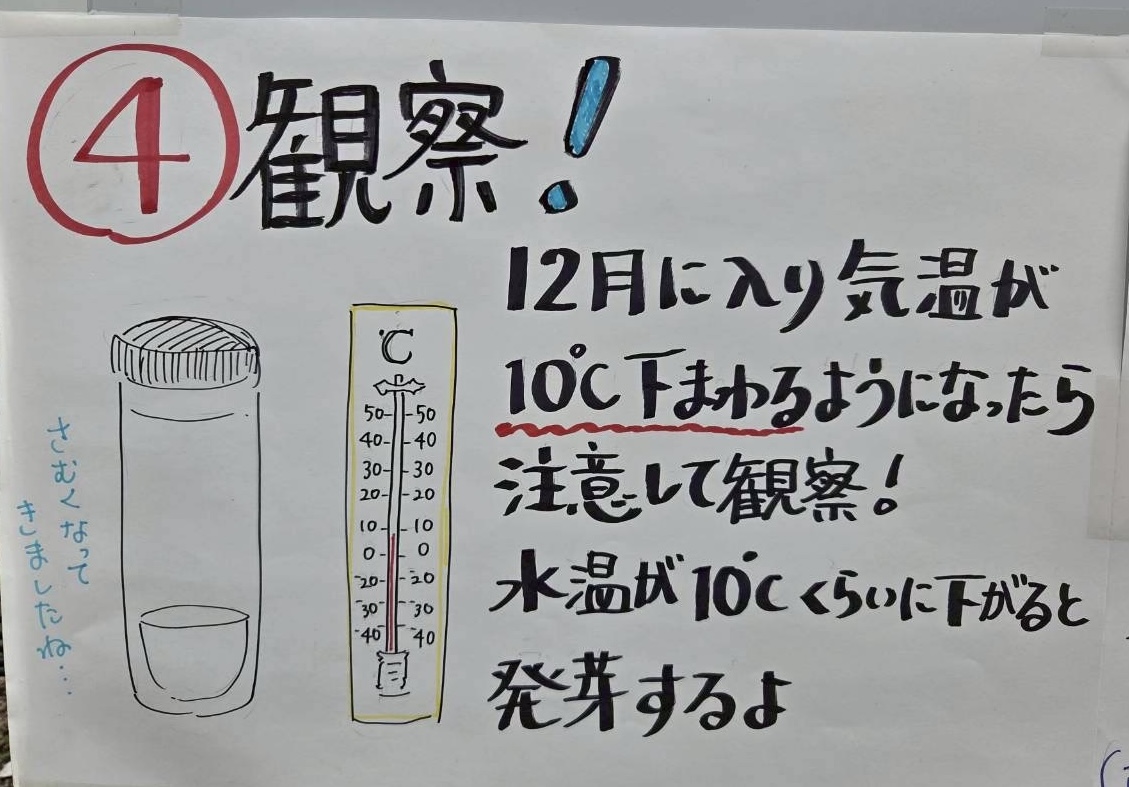 12月に入り気温が10℃を下まわるようになったら注意して観察してください。発芽するには水温が10℃くらいに下がる必要があります。