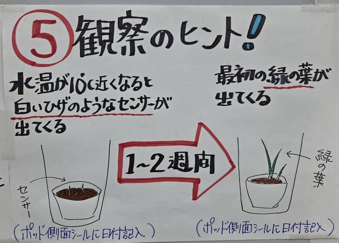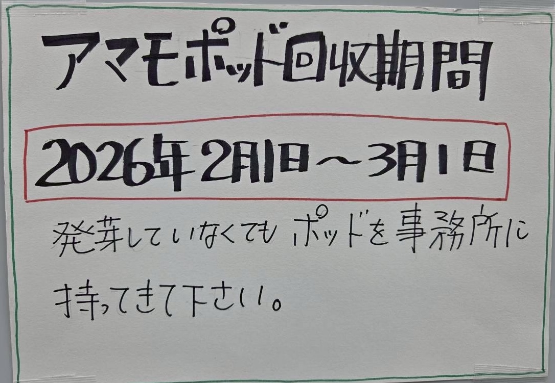 7. ポッドの回収は2026年2月1日~3月1日です。それまでに発芽しなくても設置場所を記入の上、ポッドを事務所にお持ちください。