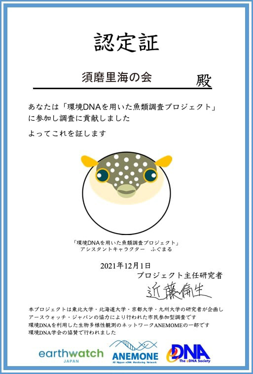 2021年9月2日、NPO法人アースウォッチ・ジャパンの活動である環境DNA分析を用いた魚類調査に提供するために、須磨の海水を採集しました。分析結果が出たら、トピックでお知らせします。